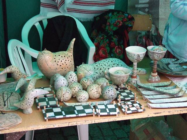 • ceramikę huculską - wykonaną z czerwonej gliny, zdobioną rylcem i polichromowaną szkliwem barwy jasno-zielonej i ciemno-błękitnej oraz glinką żółtą i brunatną.