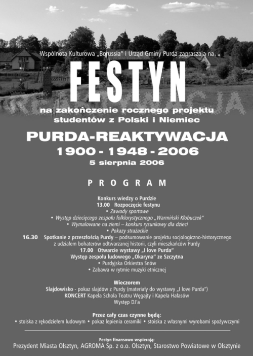 Festyn zorganizowany w dniu 5 sierpnia 2006r. na zakończenie rocznego, polsko-niemieckiego projektu "Pamięć pogranicza" przez Stowarzyszenie Wspólnota Kulturowa "Borussia" i Urząd Gminy w Purdzie.